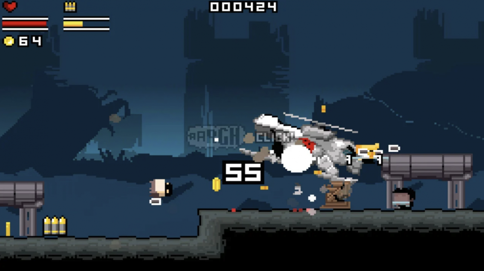 Gunslugs also has a lot of picksups throughout the game that provide health, bullets, and even new guns and grenades. The different guns do not change a whole lot of the gameplay, but it is fun to see different bullet sprites fly across the screen as you spray down the enemies.